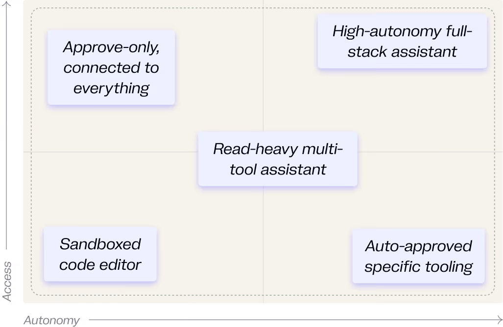 Security teams should evaluate AI agents using a simple framework: AI Agent Risk = Access × Autonomy. By mapping agents across autonomy and access, we can identify four distinct operational profiles.