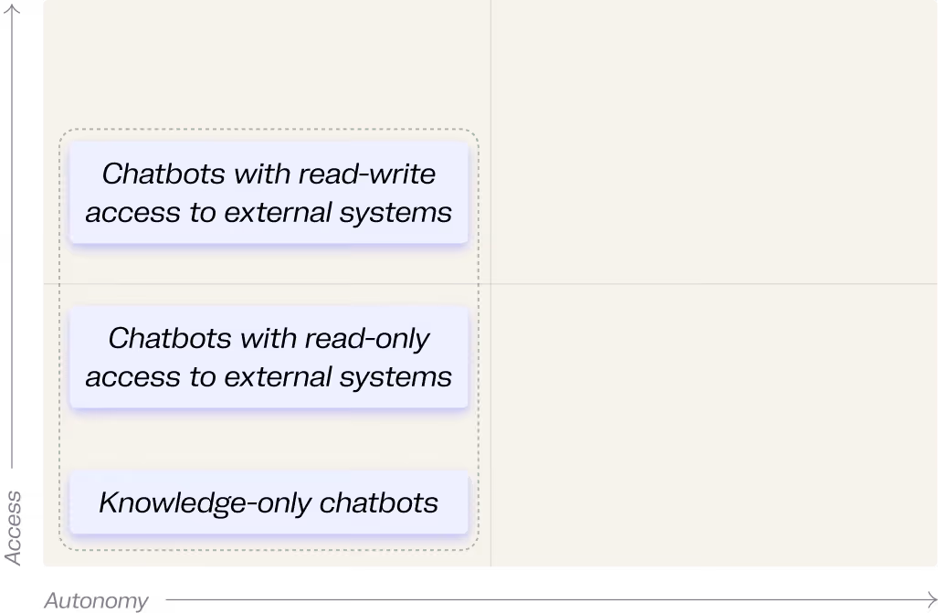 Agentic chatbots are human-triggered and don't make decisions on their own, so they occupy the left side of the graph. The variation between them is almost entirely about access, from knowledge-only chatbots up to chatbots with read-write access to external systems.