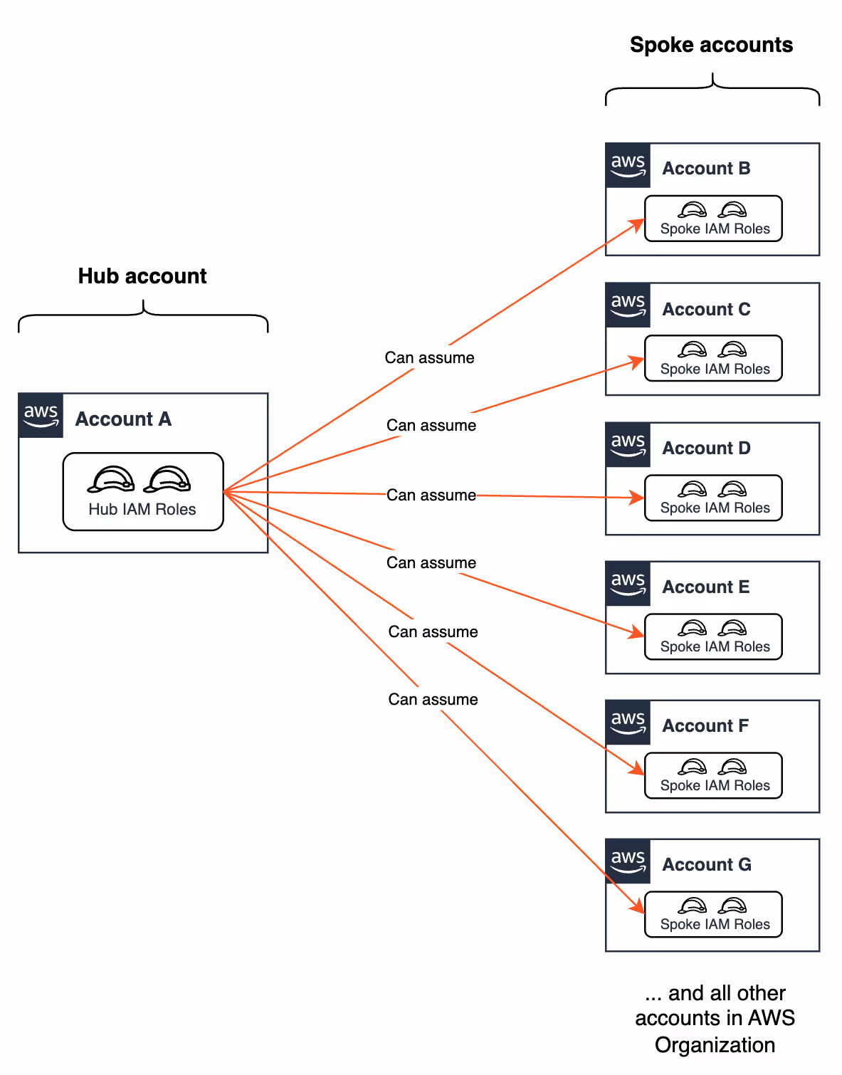 - Spoke roles are deployed in all other accounts to be assessed, trusting the hub role for access.