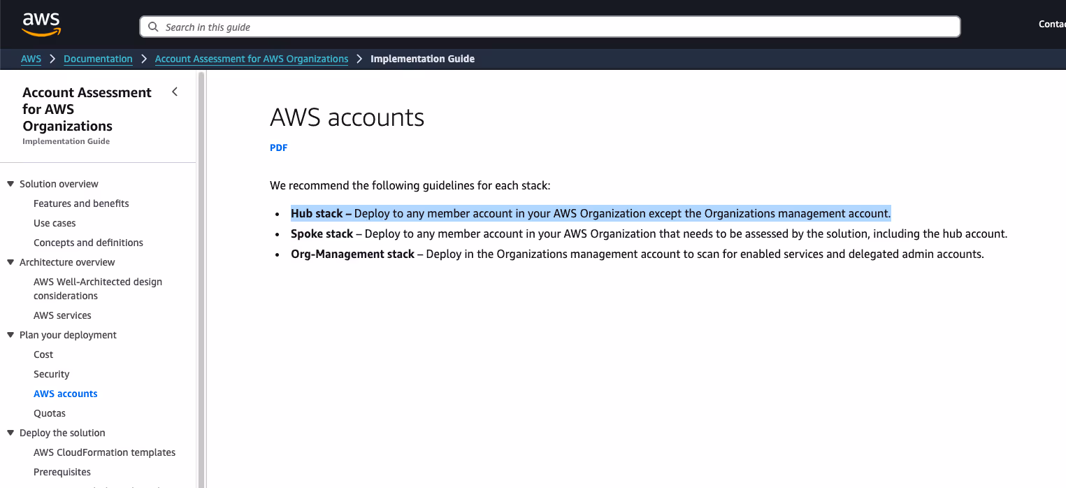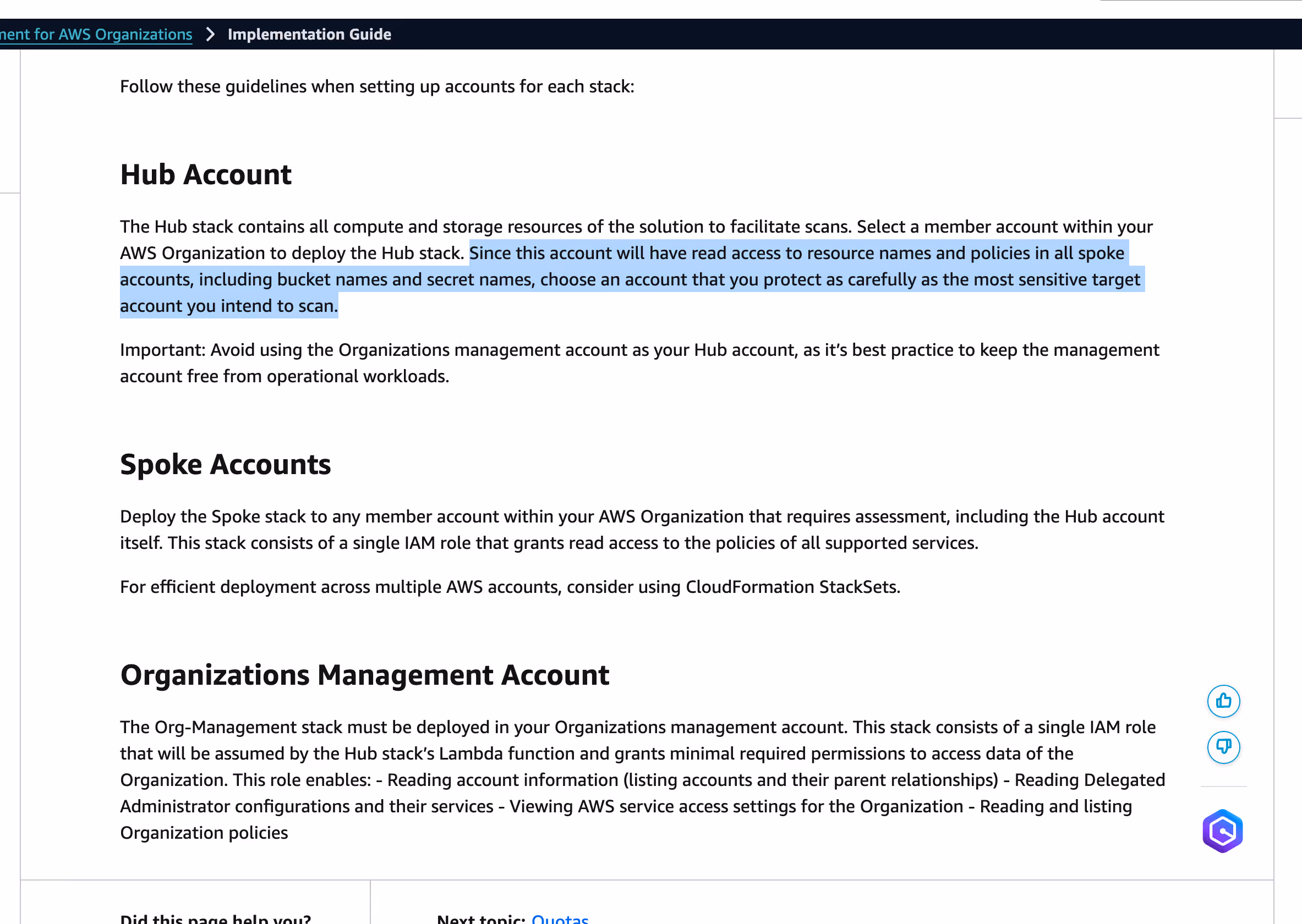 Based on this engagement, AWS revised the documentation to explicitly advise customers to deploy the hub role in a high-security account to match the sensitivity of the accounts being assessed: