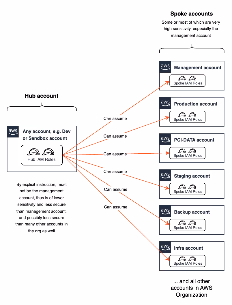 By design, the hub role must access all spoke accounts. Since AWS prohibited using the management account as the hub, customers were forced to deploy the hub in a less secure account - often a development, sandbox, or similarly low-sensitivity account. In deployed organizations, this led to the creation of a direct trust path from a lower-security account to higher-security accounts like production, PCI-DSS environments, and even the management account itself.