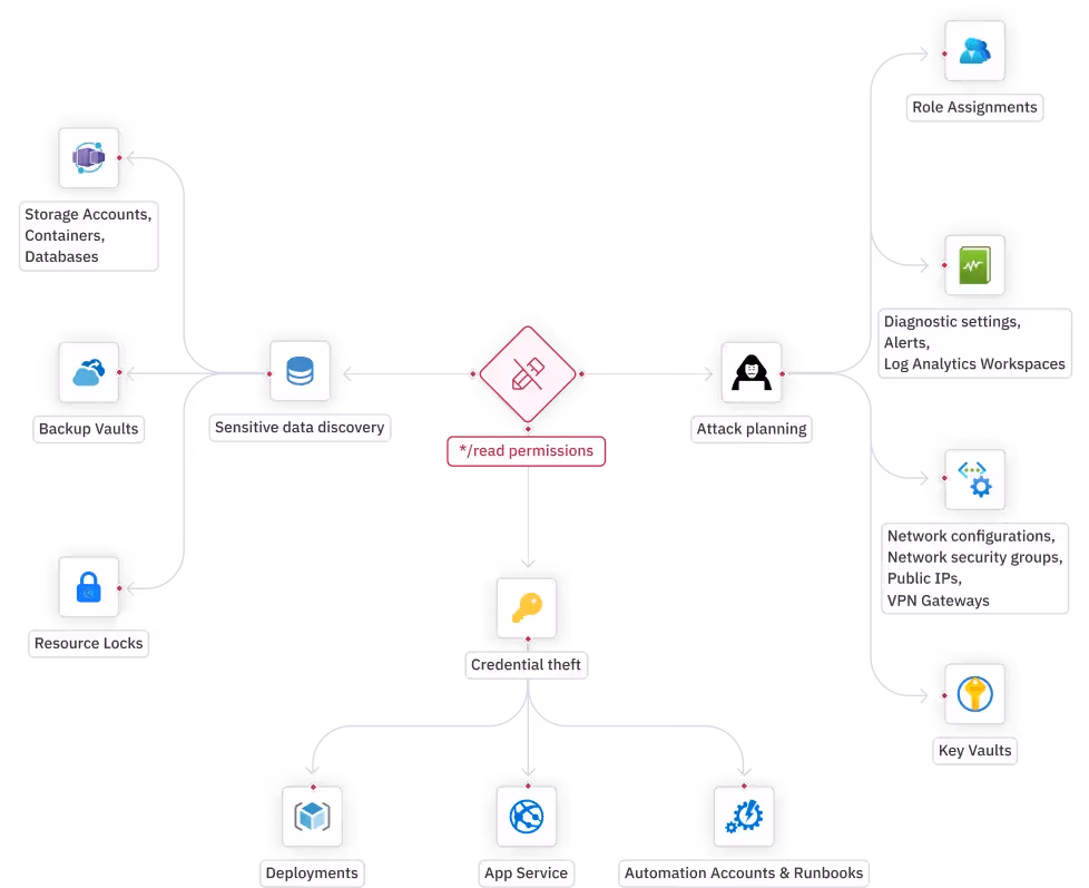 - Storage accounts, container registries, databases - Enumerating all instances and their metadata to find sensitive data spots