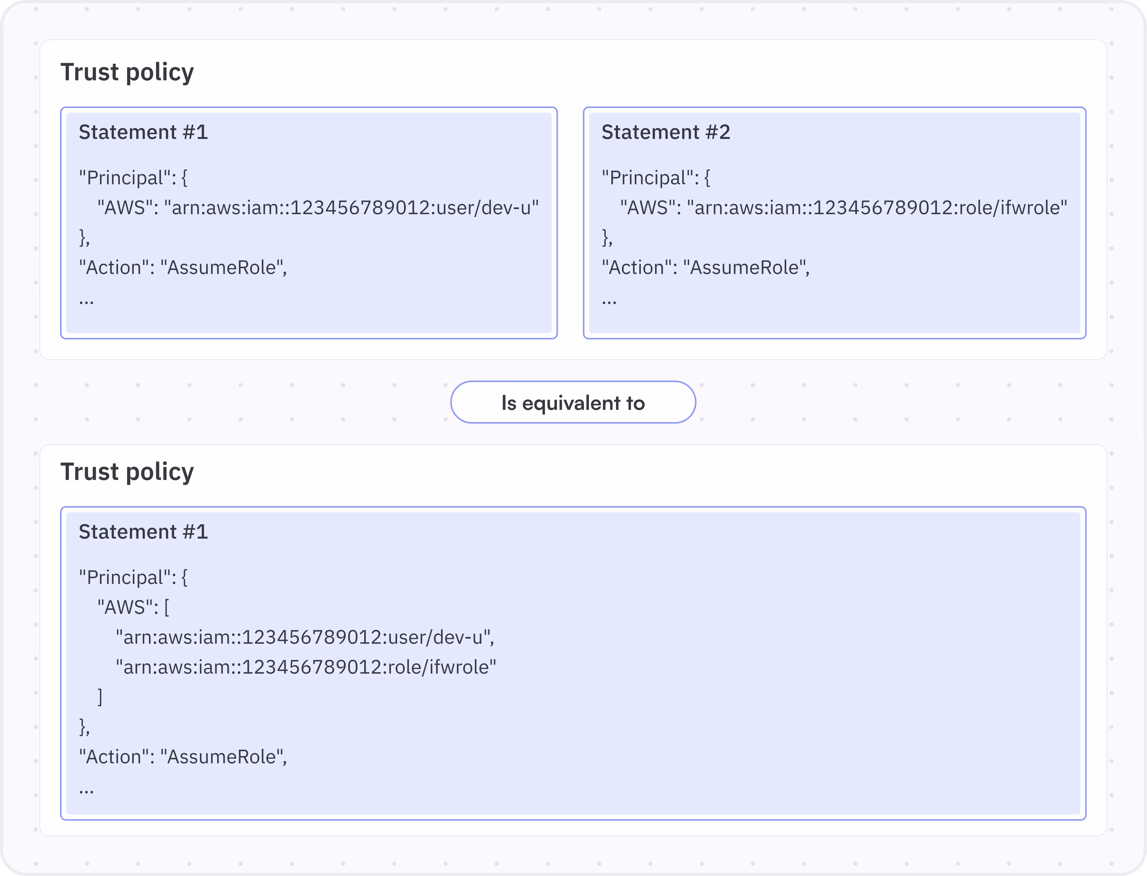 section with multiple values – AWS allows specifying multiple principals in an array under the same statement, which is interpreted as OR, not AND.