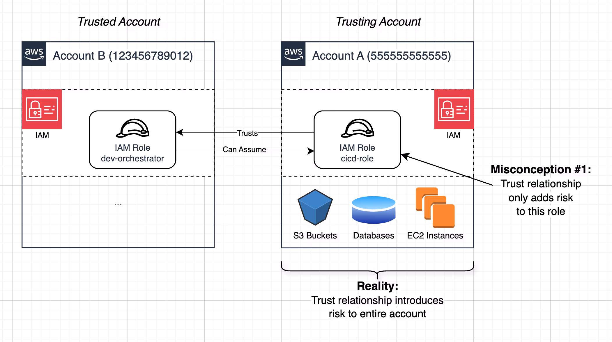 A common but dangerous assumption is that trusting a specific role or user in another account ensures risk is contained to just that principal. In reality, the trusting account has no actual way to enforce how that principal is secured within the trusted account - meaning that trusting a principal effectively means trusting the entire account it belongs to.