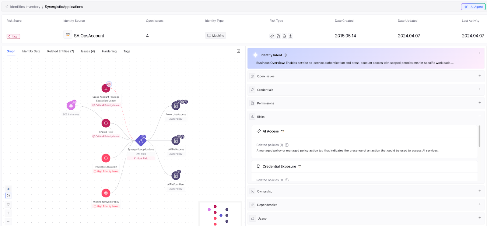 The approach is intentionally pragmatic. A strong example for detection is our analysis of trust policies in AWS. If an IAM role’s trust policy allows it to be assumed by known AI service principals such as Amazon Bedrock or SageMaker, that role gets the AI_ACCESS tag. When the trust policy doesn’t tell the story, name-based heuristics act as a fallback and user/group naming patterns are scanned for AI-related indicators. Another example is Google Cloud. With the powerful toolset offered by Vertex AI, there are many ways for AI Agents to access identities. We analyze jobs, pipelines, instances, and endpoints and tag associated service accounts to mark it as AI-accessible. Those Vertex AI attachments are surfaced as Dependencies in the SIP side panel so you can trace the relationship from identity to AI resource. When attachments aren’t present, descriptive metadata and naming cues provide the fallback signal.